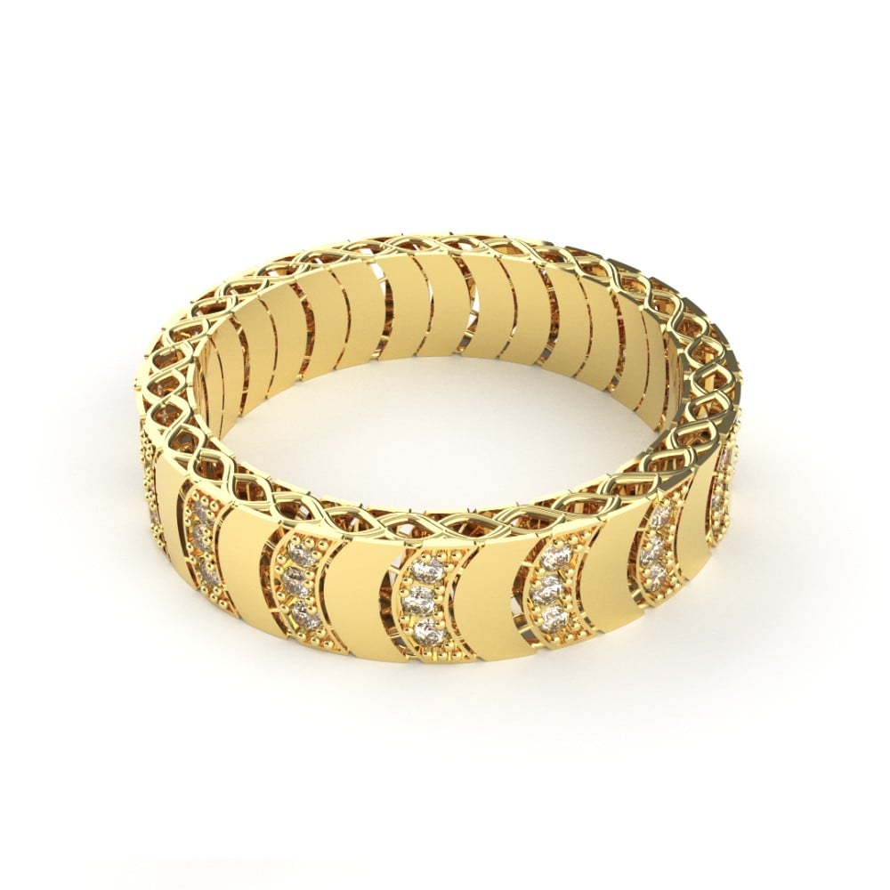 - خاتم بتصميم خطوط مائلة ذهبية يفصلها فصوص متراصة من أحجار الزركون تأخذ نفس الشكل المائل مع جوانب شبكية.