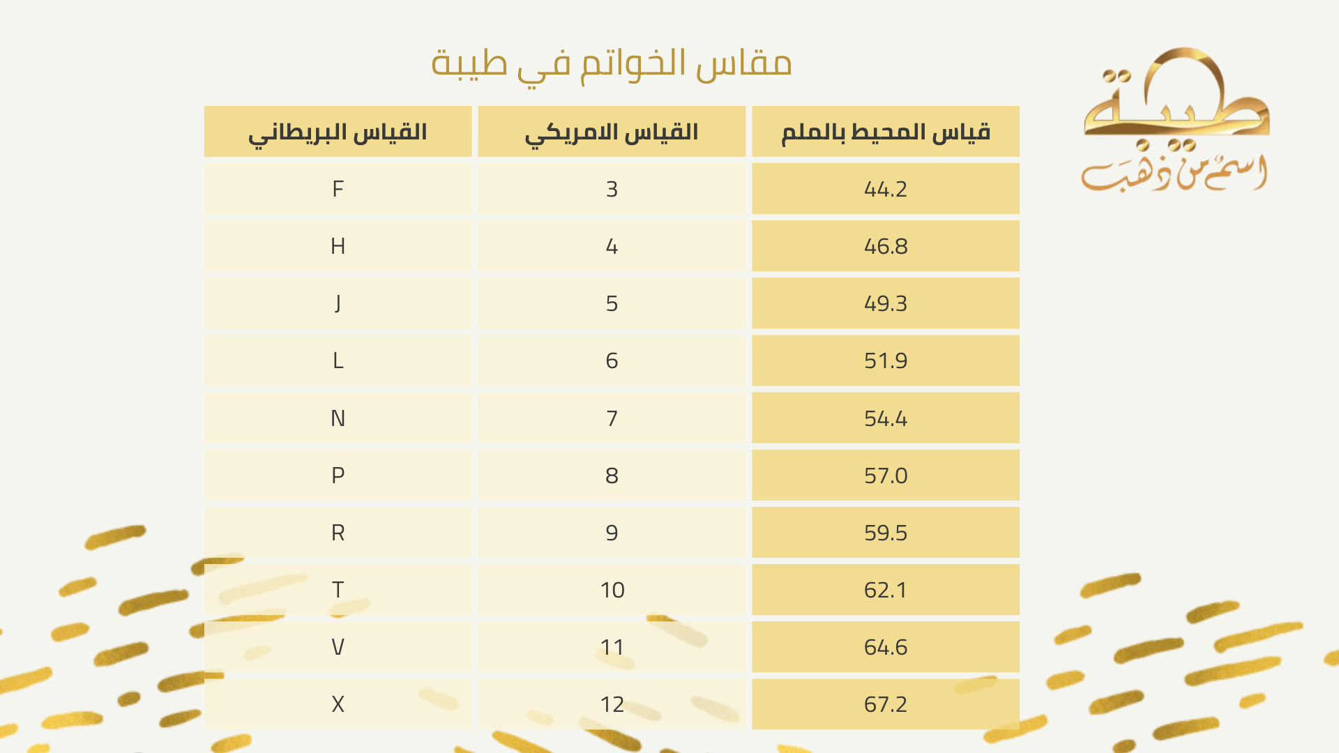 5. قارني الرقم بالموجود على الجدول لتعرفي قياسك في طيبة للذهب.