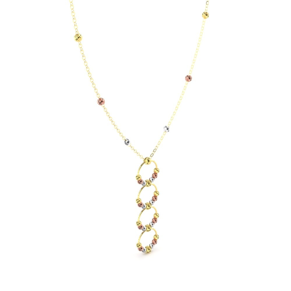 - تصميم السلسلة: سلسال ذهب مكون من 4 حلقات ذهبية متراصين بالطول، يزينها حلقات دائرية صغيرة ملونة.