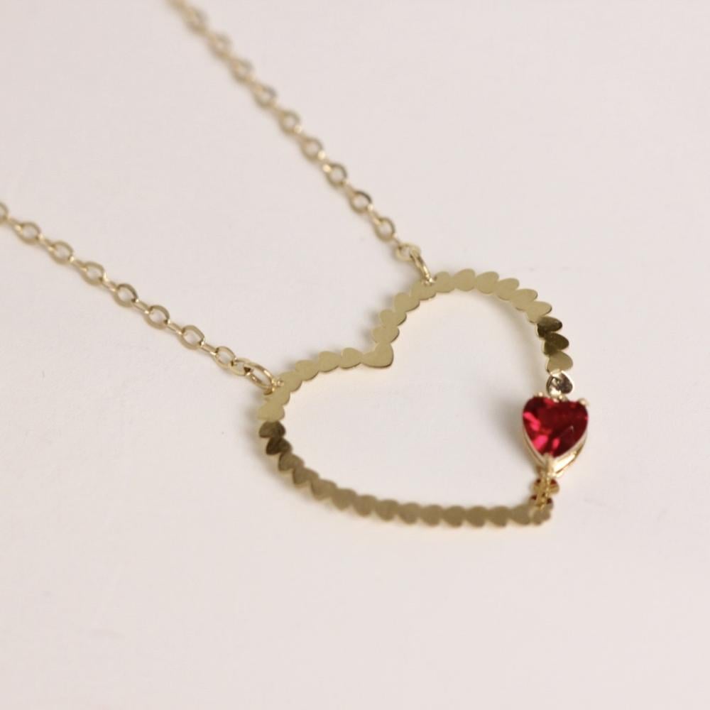 • التصميم: سلسلة رقيقة مع حلية على شكل قلب كبير مفرغ وفص أحمر صغير