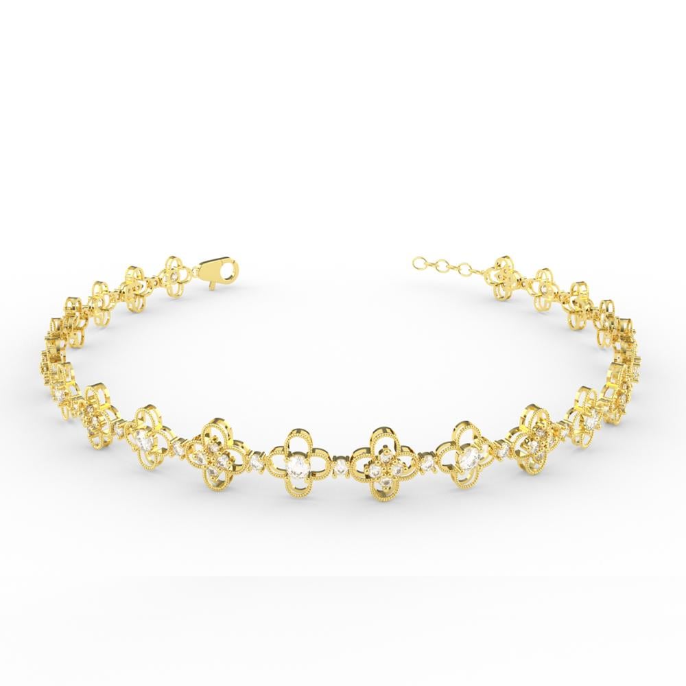 سوارة ذهب غير عادي بتصميم يجمع بين الإبداع الأوروبي والمهارة العربية في صناعة الحلي منذ مئات السنين بتطعيم من الفصوص البيضاء النقية يجعل السوار خاطف للعيون مع أقل حركة، سوار طيبة الجديد يأتي بتصميم الزهرة الرباعية المطعم بالفصوص البراقة ليكون أنسب خيار في إطلالة السهرات الناعمة متكاملة الجمال.