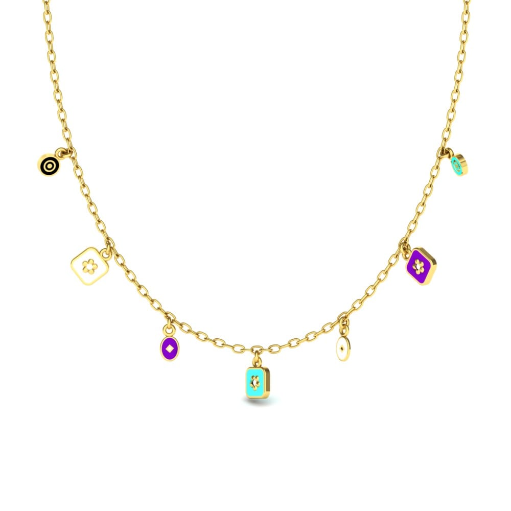 • قلادة ذهب ايطالي بتصميم مميز يتدلى منها قطع ذهبية مزخرفة تأخذ أشكال ملونة ومميزة.