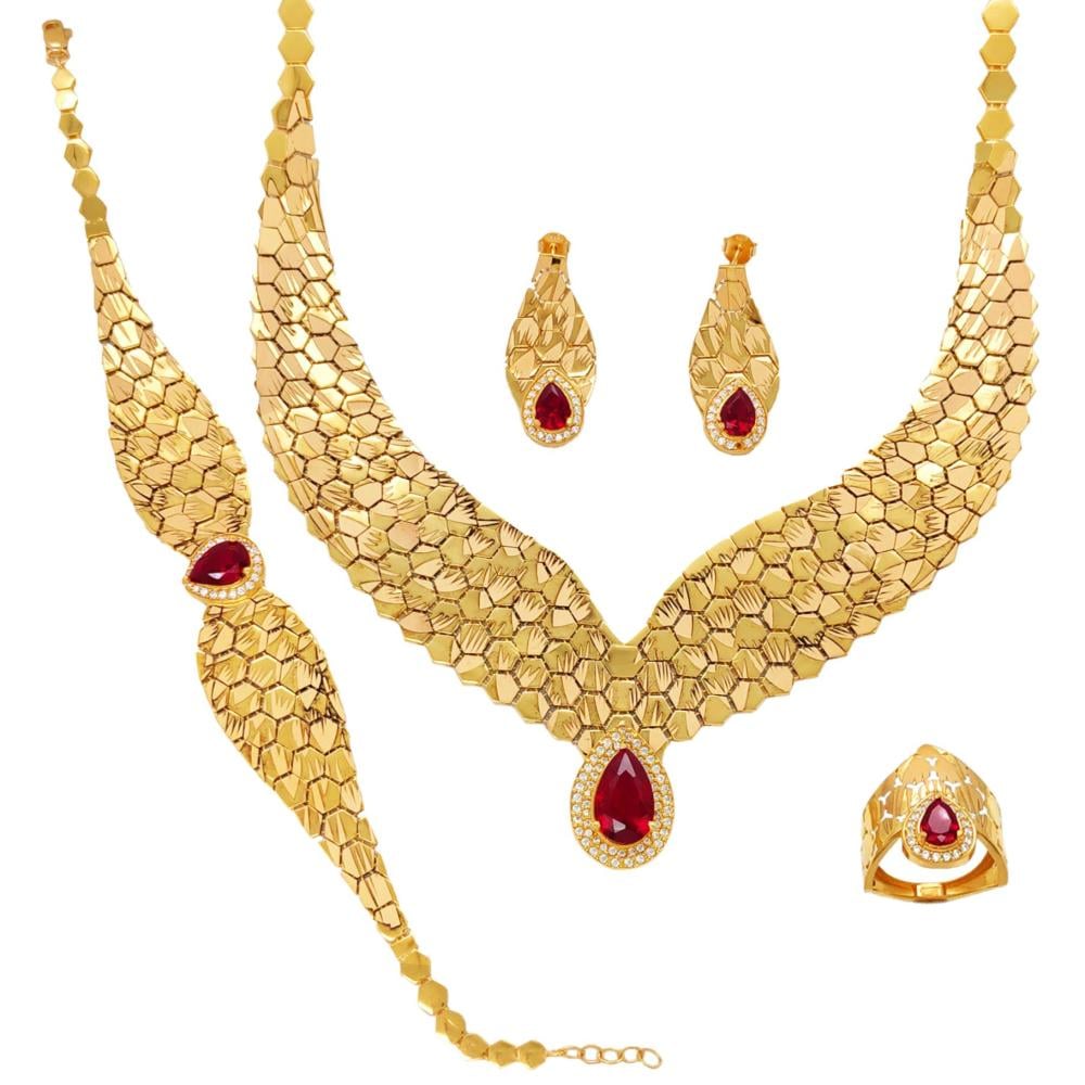 ✨ تميّزي بإطلالة ملكية مستوحاة من قوة وهيبة الصقر مع هذا الطقم الذهبي الفاخر المصنوع من ذهب عيار 21 وبوزن 52.32 جرام. التصميم المتقن مستلهم من شكل الريش الذهبي ومطعّم بحجر أحمر فاخر يضفي لمسة من الجاذبية والرقي.