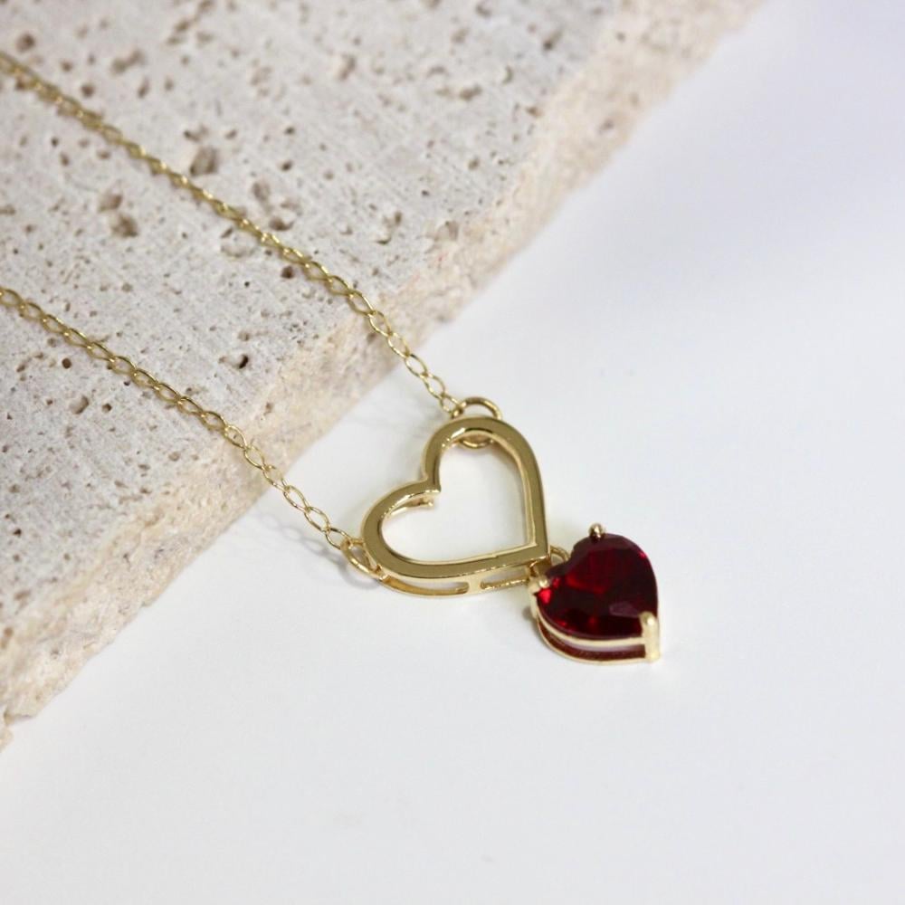 - التصميم: سلسلة رفيعة مع تعليقة مركزية بشكل قلب مفرغ، ويتدلى منه فص أحمر كبير
