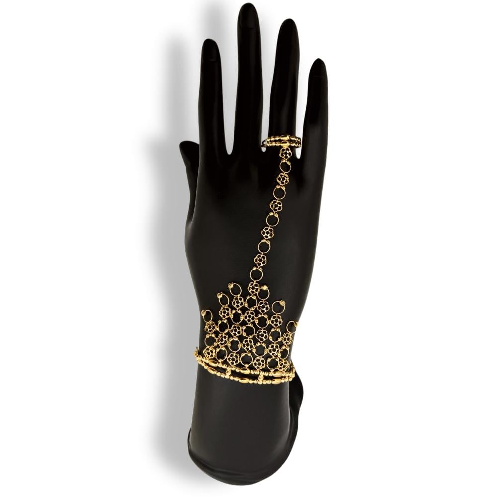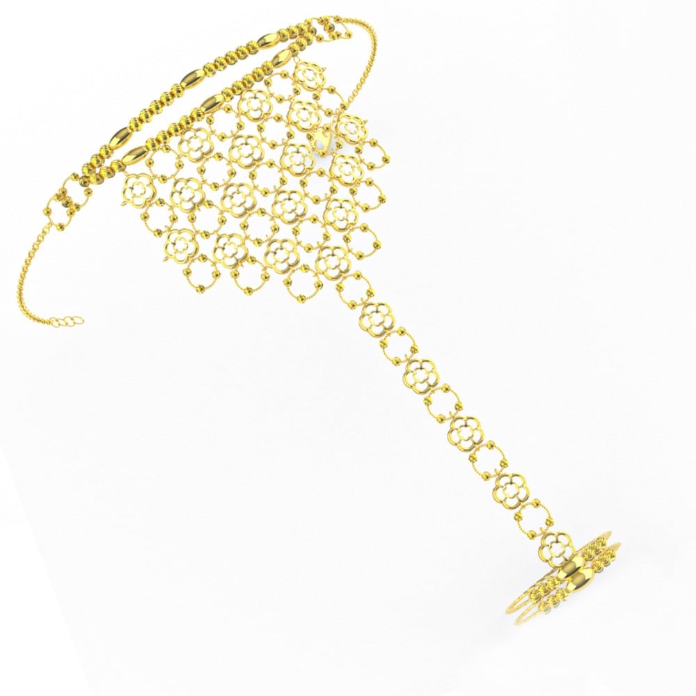 كفوف ذهبية أنيقة مصنوعة من ذهب أصلي عيار 21، بتصميم شرقي يجمع بين الفخامة والرقة. تم تنفيذ التفاصيل بعناية فائقة لتمنحك قطعة فنية تليق بكل مناسبة خاصة. تضيف هذه الكفوف لمسة ملكية لإطلالتك، سواء في الأعراس أو المناسبات المميزة.
